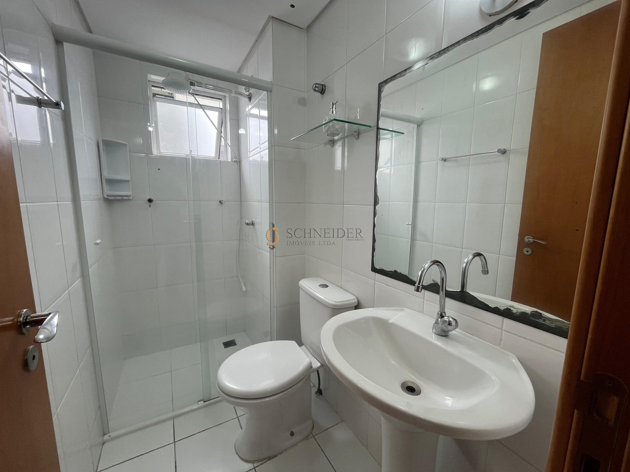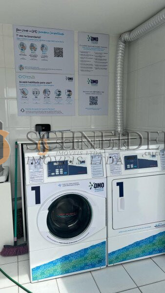 Prédio pastilhado, com dois elevadores, salão de festas com churrasqueira, mercadinho, lavandeira industrial OMO e bicicletário.